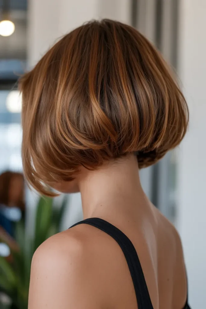 The rounded bob creates a soft, curved silhouette that looks elegant and full from the back. The rounded shape gives hair a bouncy, voluminous, and youthful appearance.