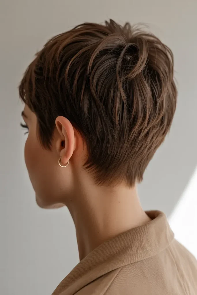 The pixie cut is a bold and confidence-boosting haircut for women over 50 in fall 2026. From the back, it looks clean, tapered, textured, and modern, giving a sharp yet feminine silhouette.