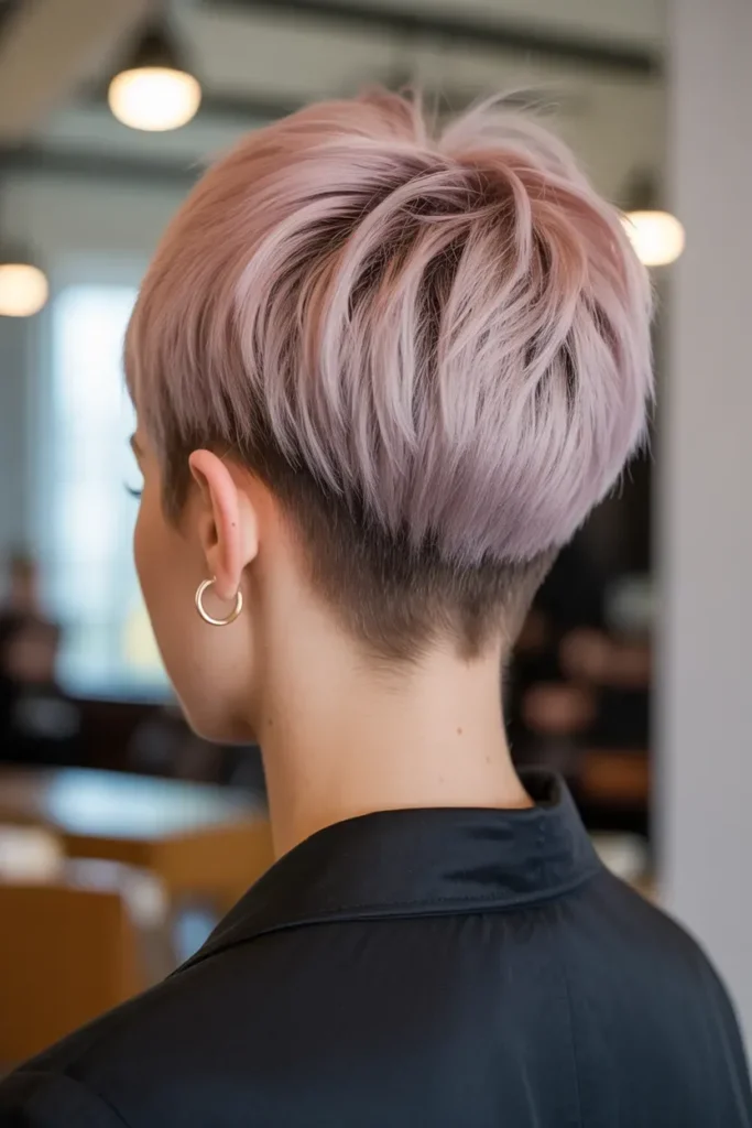 A tapered short haircut creates a neat, structured, and elegant back profile. The neckline is softly faded, giving a clean and sophisticated look.