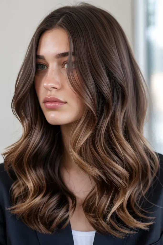 Mocha brown balayage is a top choice for fall 2026 because it offers a low-maintenance yet dimensional look. The deep mocha base is softly lifted with lighter brown and caramel tones, creating seamless transitions.