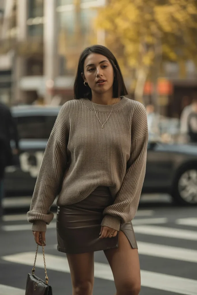An oversized knit sweater paired with a mini skirt is one of the cutest fall 2026 outfit ideas for stylish women. The soft, oversized sweater creates a cozy and warm feel, while the mini skirt keeps the outfit playful and trendy. This look feels perfect for coffee dates, fall street photos, casual hangouts, and aesthetic mirror selfies, giving off a soft-girl vibe that feels sweet, trendy, and comfortable.