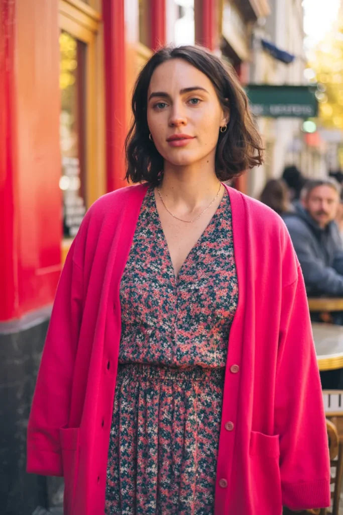 A soft cardigan layered over a floral midi dress creates a romantic and cute fall outfit that feels feminine and gentle. The floral dress adds charm and sweetness, while the cardigan brings warmth and comfort, making this look perfect for soft girl fashion, Pinterest outfit inspiration, brunch dates, and cozy café outings.