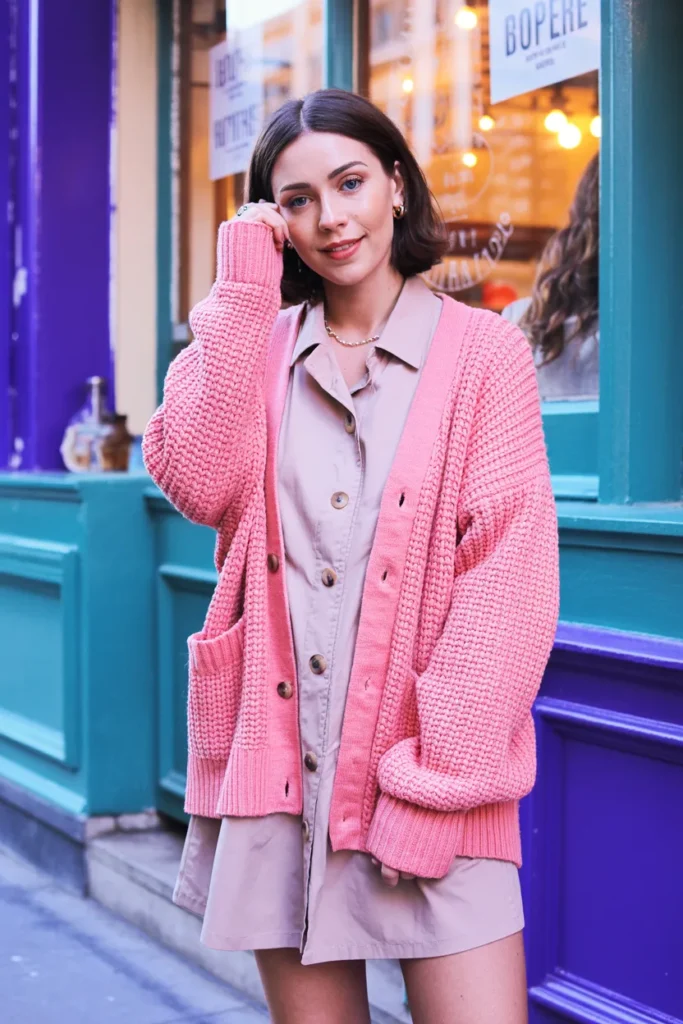 A chunky cardigan layered over a mini dress creates a cute, cozy, and girly fall outfit that feels playful and soft. The oversized cardigan adds warmth and comfort, while the mini dress keeps the look feminine and trendy. This outfit is perfect for cute café dates, fall selfies, casual outings, and Pinterest aesthetic fashion boards.