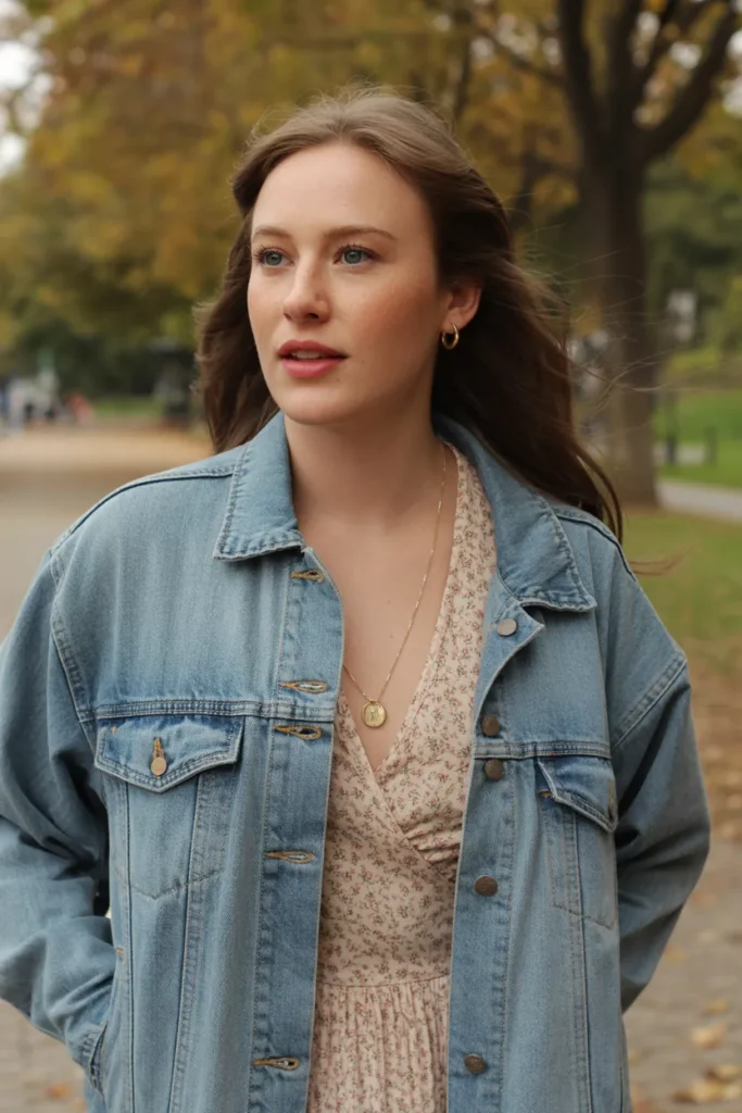 A cropped denim jacket layered over a floral dress creates a sweet and cute fall outfit that feels youthful and charming. The denim jacket adds a casual touch, while the floral dress keeps the look feminine and playful. This outfit is perfect for fall photoshoots, casual autumn days, Pinterest fashion inspiration, and Instagram outfit posts.