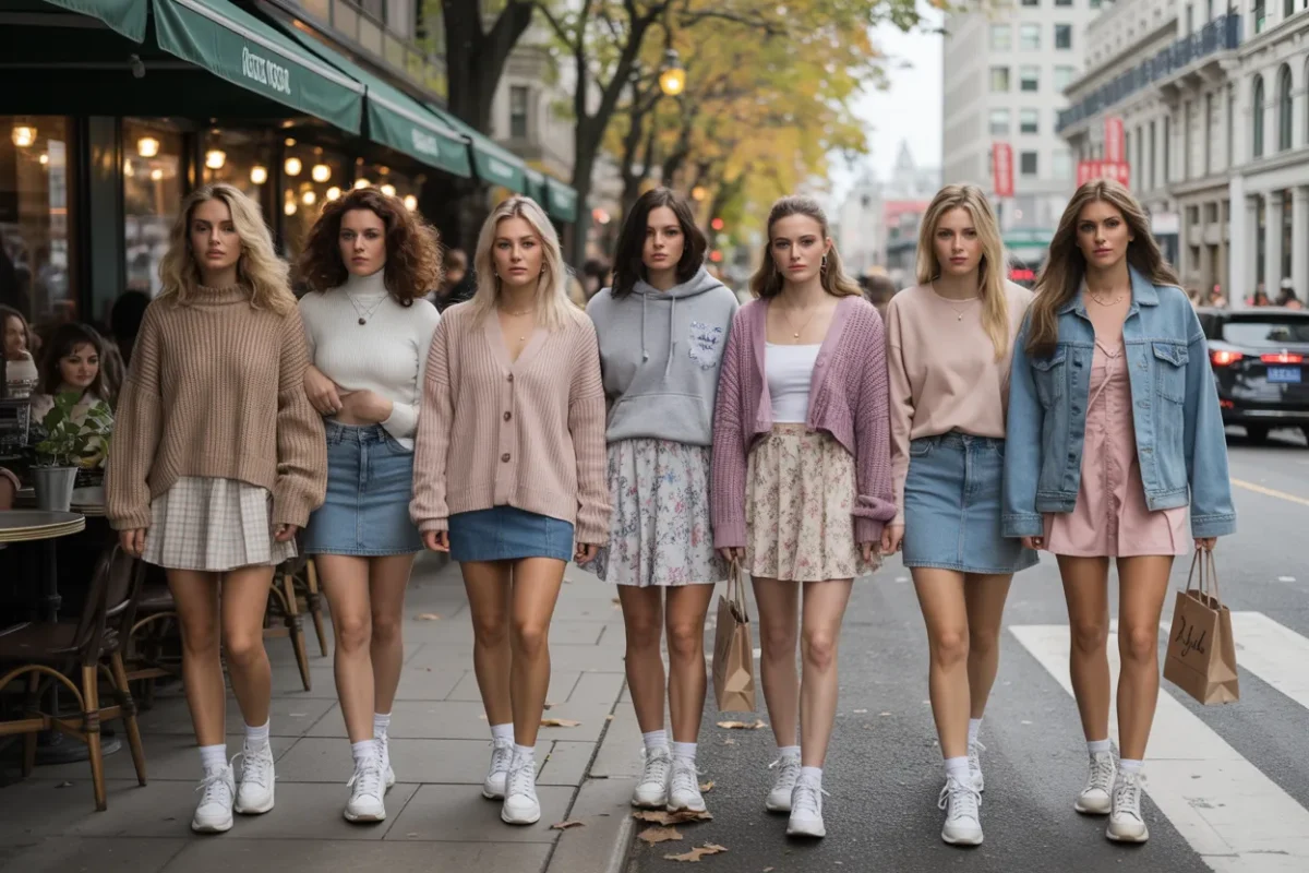 Styled with sneakers, pastel tones, cute hair accessories, and minimal jewelry, this outfit gives off a fun, trendy, and adorable streetwear aesthetic. Soft colors like lavender, baby blue, blush, and cream make this one of the cutest fall 2026 outfit ideas for stylish women.