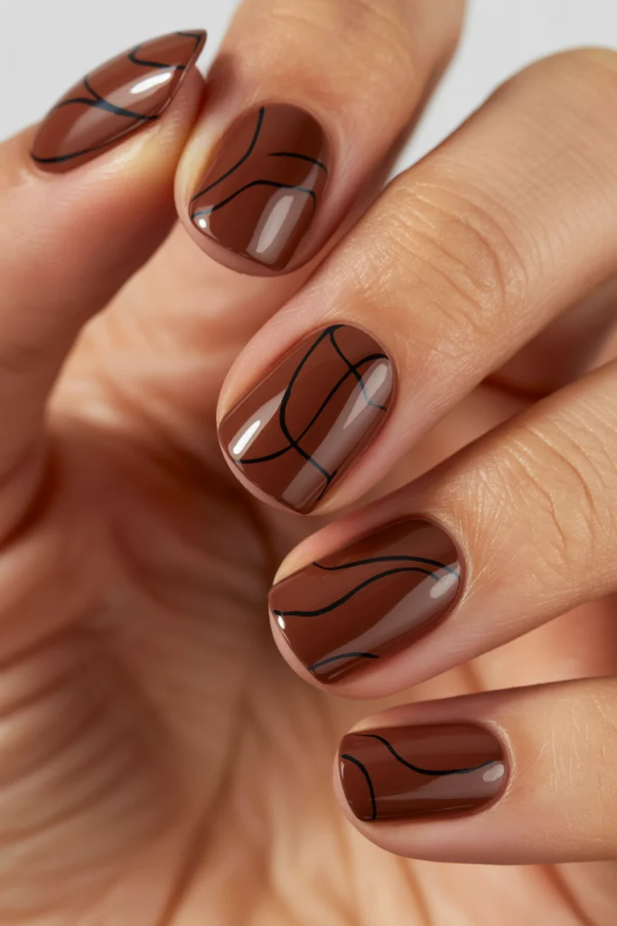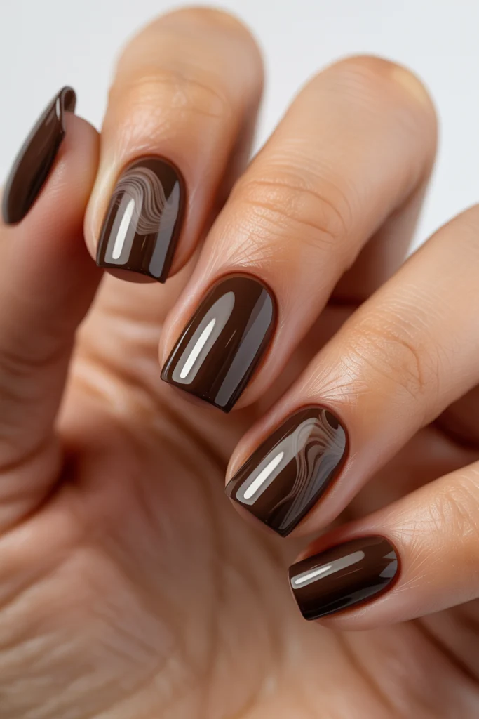 Soft mahogany mocha combines deep brown with subtle red undertones, creating a rich yet refined early fall nail shade. Unlike darker burgundy tones, this color feels smoother and more wearable, making it ideal for September. It adds depth and warmth while maintaining a polished look that doesn’t feel heavy or overpowering.
