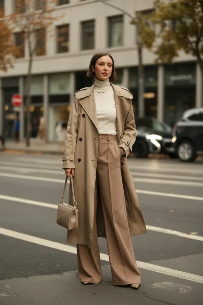 The movement of the coat paired with structured trousers makes the outfit visually stunning in motion. Neutral shades like camel, taupe, and mocha elevate the polished aesthetic, giving strong boss girl, main character autumn vibes that fashion lovers can’t ignore.