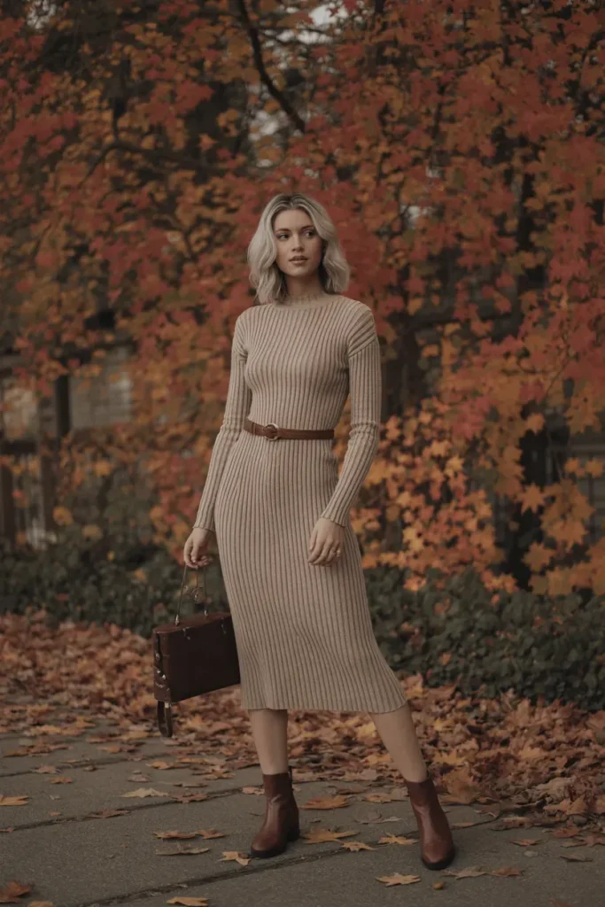 This look captures the soft, cozy, and romantic side of autumn 2026. A ribbed knit midi dress paired with ankle boots creates a silhouette that feels warm, flattering, and effortlessly graceful. It’s the kind of outfit that looks perfect in autumn leaf photos, café dates, and seasonal Instagram posts.