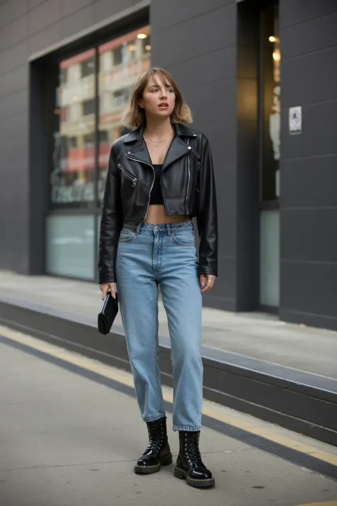This outfit represents the bold, edgy, and confident side of fall fashion. A cropped leather jacket paired with straight leg jeans gives off urban streetwear energy mixed with rebellious attitude the kind of outfit that dominates TikTok and Instagram street style edits.