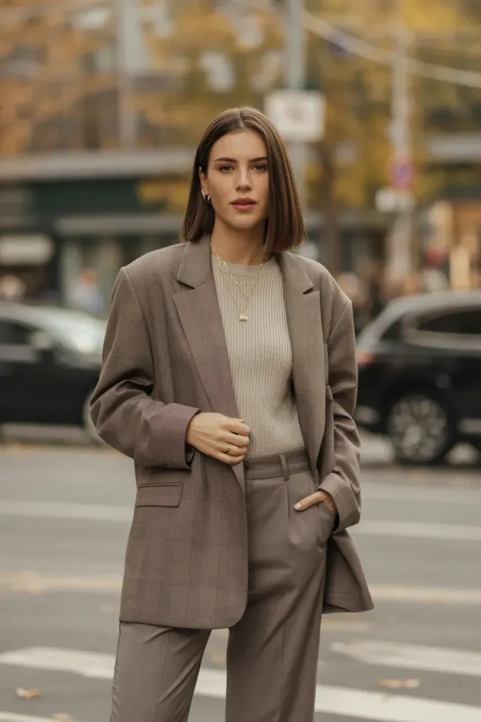 The oversized fit adds a relaxed yet authoritative tone, making the outfit visually strong and editorial worthy. Neutral shades like gray, beige, and chocolate brown enhance the minimal luxury fall vibe that feels modern and empowering.