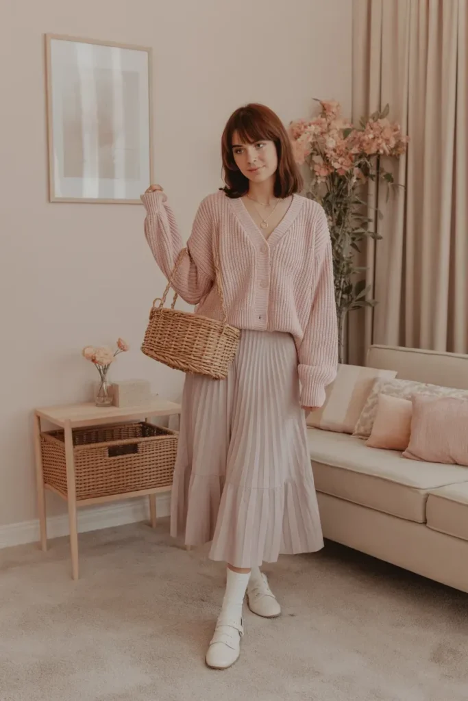 This outfit embodies the gentle, romantic, and dreamy autumn aesthetic. A chunky cardigan layered over a flowy midi skirt creates a soft silhouette that feels like a Pinterest cottagecore board mixed with fall nostalgia.