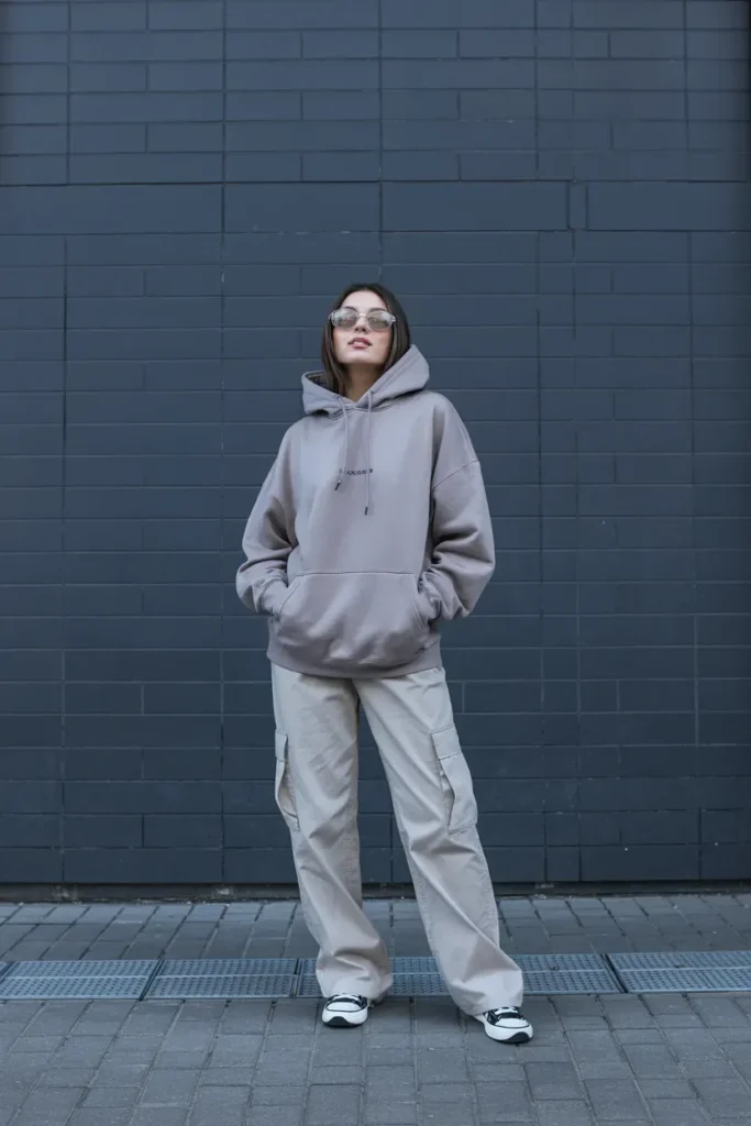 This outfit defines laid back, trendy, and modern fall streetwear. An oversized hoodie paired with cargo pants creates a look that feels cool, comfortable, and effortlessly stylish perfect for casual content, campus vibes, and everyday aesthetic outfits.
